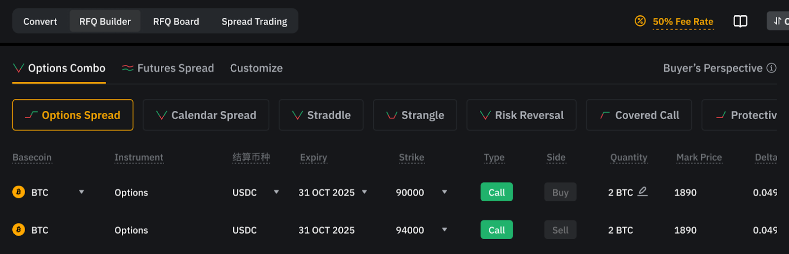 • RFQ Builder: Create strategies and send RFQs to liquidity providers.