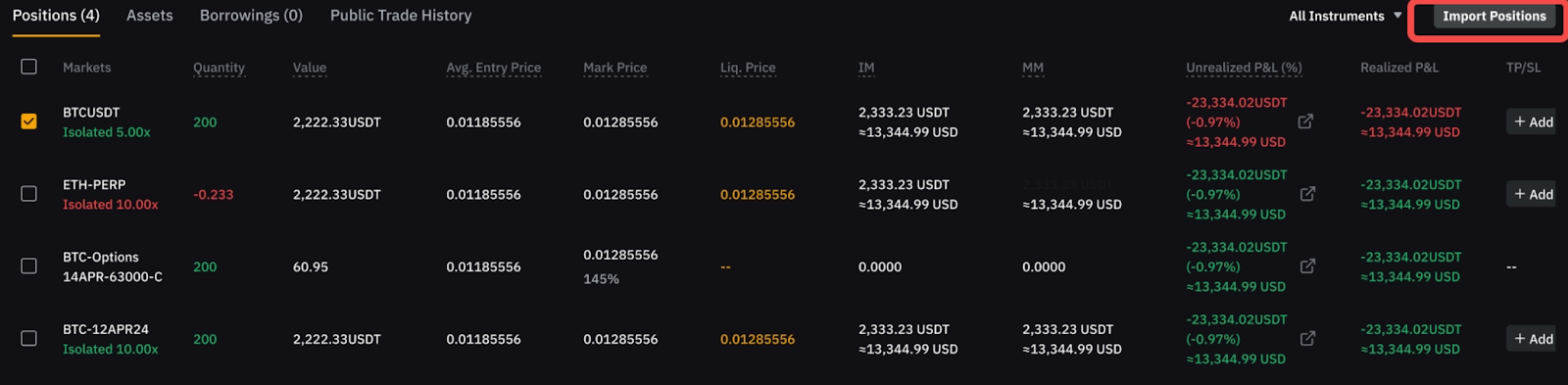 Step 2: Select the position you wish to close. The Import Position button will become available in the top-right corner of the bottom section.