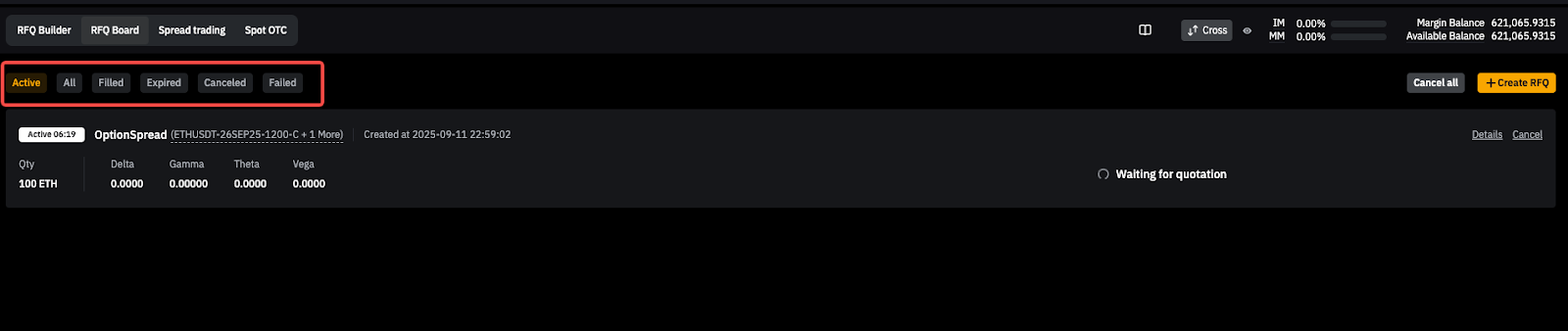 Once you've sent an RFQ, you can track it and view quotes from liquidity providers on the RFQ Board.