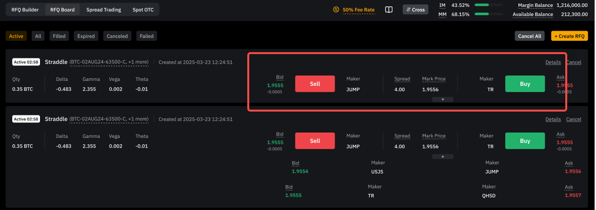 Step 2: In the Active tab, you'll see the best bid and ask quotes for your RFQ. Click the Expand icon to view up to three of the most competitive quotes, then click Buy or Sell to accept a quote.