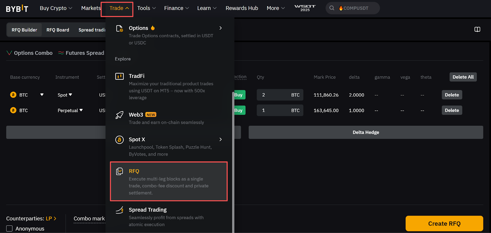 Step 1: Log in to the Bybit website and click TradeRFQ in the navigation bar to go to the RFQ page.