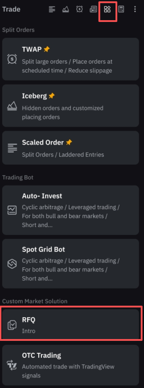 Alternatively, you can access RFQ on the Spot/Futures trading page by clicking the Tools icon in the Trade panel on the right.