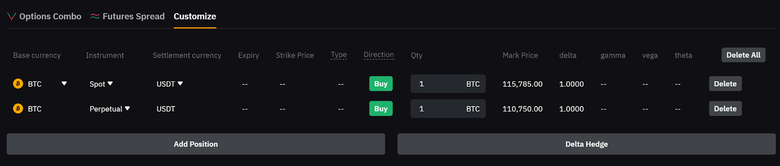 — To hedge risk, click Delta Hedge and the system will automatically add a hedging position.