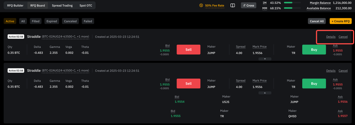• RFQ Board: View RFQs along with quotes from liquidity providers.
