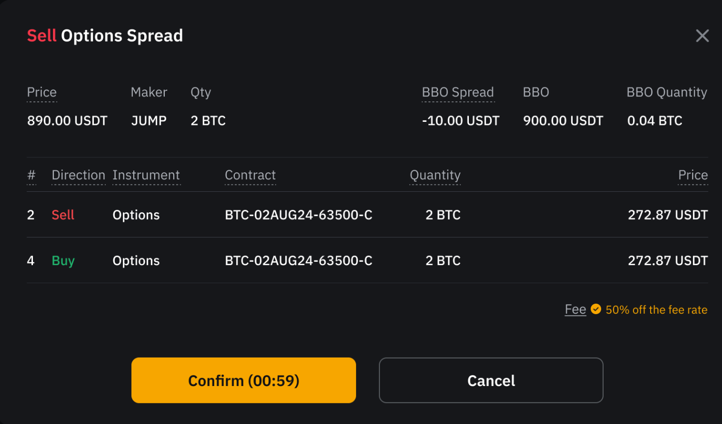 Step 3: A confirmation window will appear. Review the quote details, including the price, Maker and quantity, then click Confirm to execute the trade or click Cancel to discard.