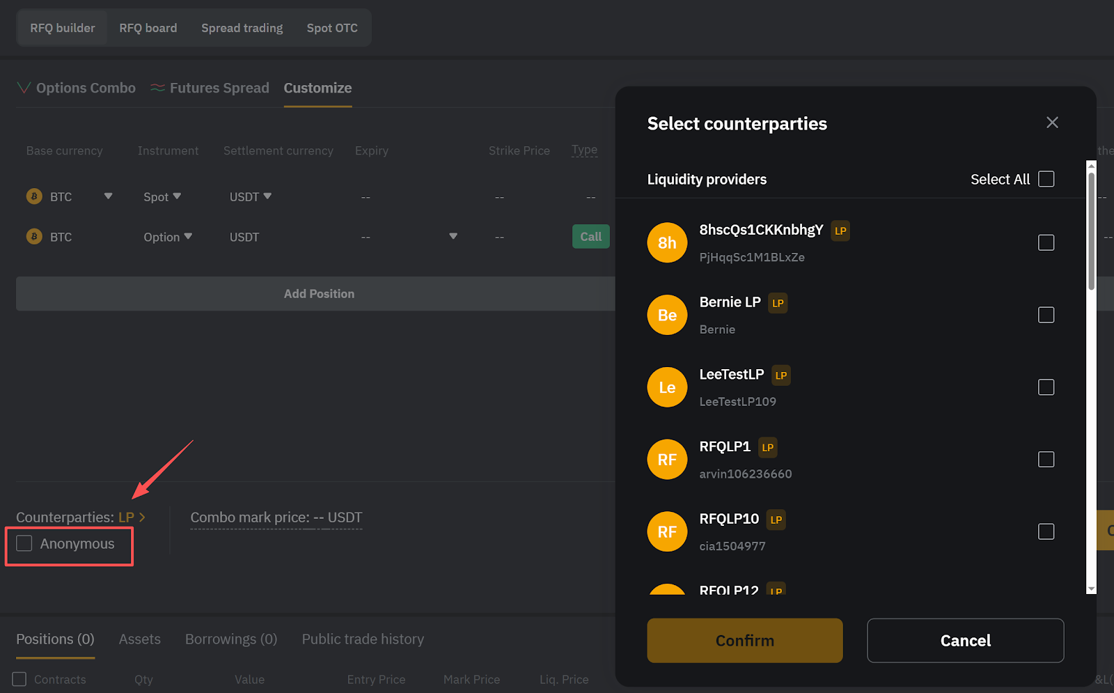 Step 6: After setting up your strategy, click LP in the lower left to select one or more counterparties. For maximum confidentiality, check the Anonymous box.