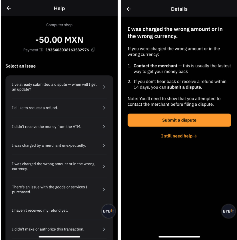 Here’s a step-by-step guide to help you submit a Bybit Card transaction chargeback dispute, whether it’s for an online or offline purchase, or an ATM withdrawal.