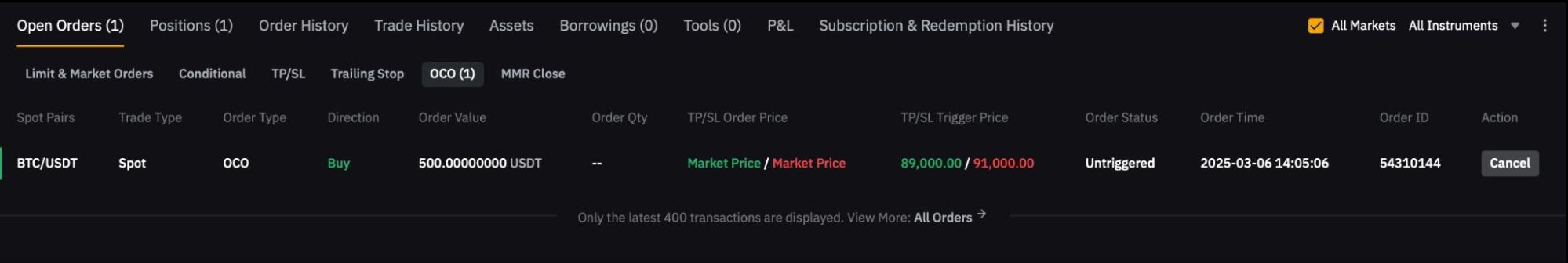— For OCO TP/SL with the conditional limit order, please note that when one of the conditional limit orders is triggered, the corresponding SL or TP order will be canceled, even if the limit order is not filled. This is because the system treats a set of TP/SL OCO orders as a whole. As long as the trigger price of one order is achieved, the trigger condition is considered fulfilled, and the corresponding order will be canceled.