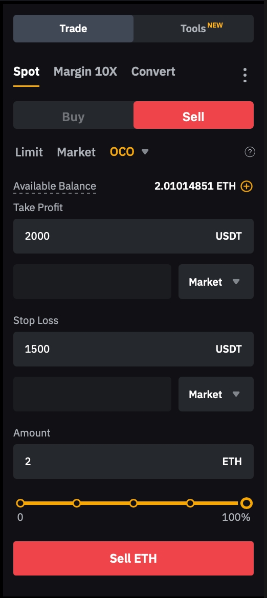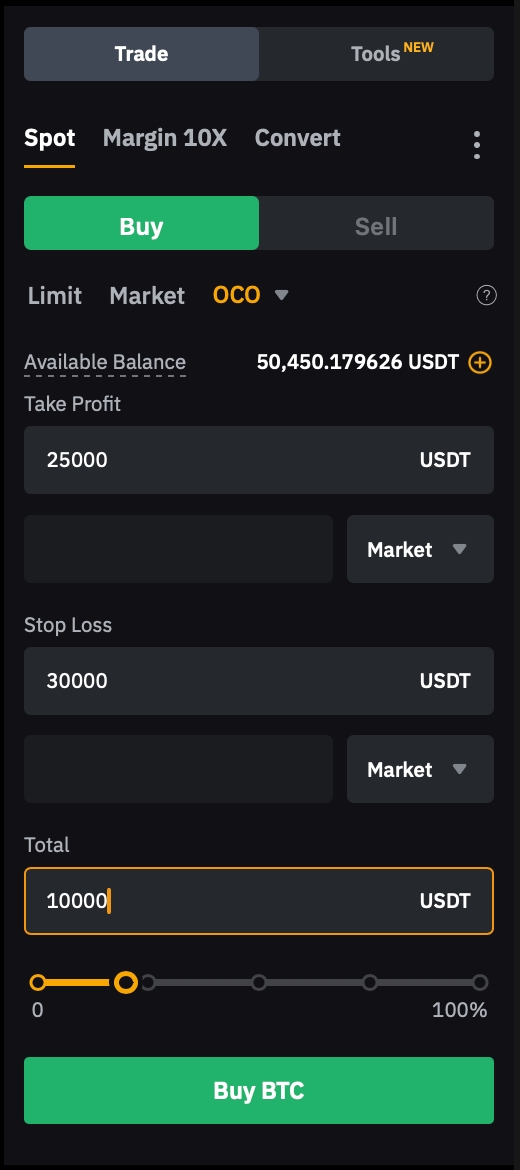Exclusively for Spot and Spot Margin Traders: OCO orders are available only to users engaged in Spot or Spot Margin trading.