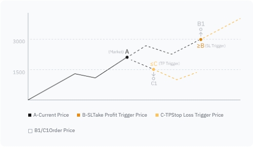 A Bybit OCO order is set up with two (2) directional triggers: one for the upper limit and one for the lower limit relative to the current trading price. When one direction is triggered, the other direction is automatically canceled, and the market or limit order set in the triggered direction takes effect. When an OCO order is placed, only a one-sided order cost will be occupied.