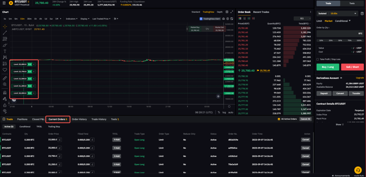 After submitting a scaled order successfully, your chart will be updated to reflect your scale order at different price variances accordingly. You can check your placed limit order from the Current Orders tab.
