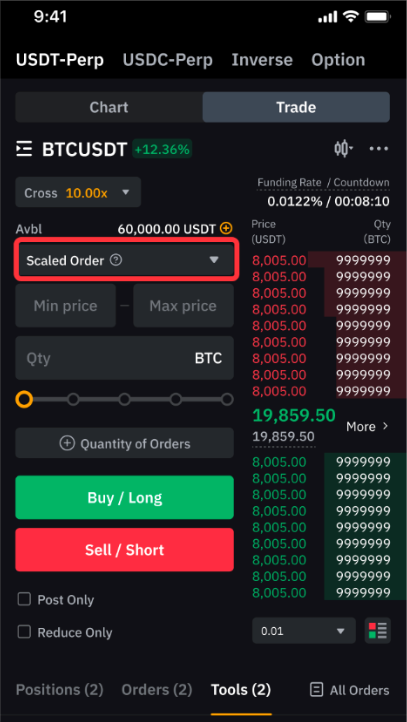On the App, go to the Trade tab. Tap on the order type dropdown menu, select Scaled Orders, and input your preferred Price Range (the upper and lower bound of your scaled order) and Quantity for your scaled order.