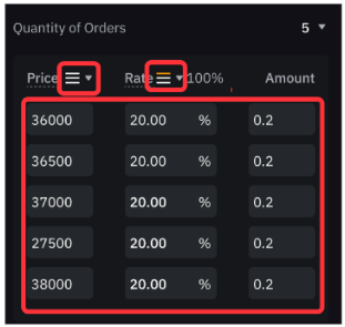 • The entry price and order size for each sub order will decrease by a factor of the previous entry price or order.