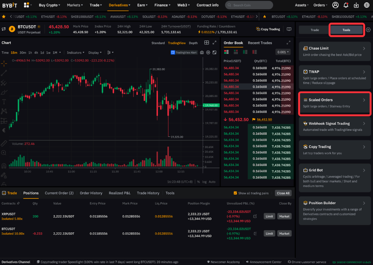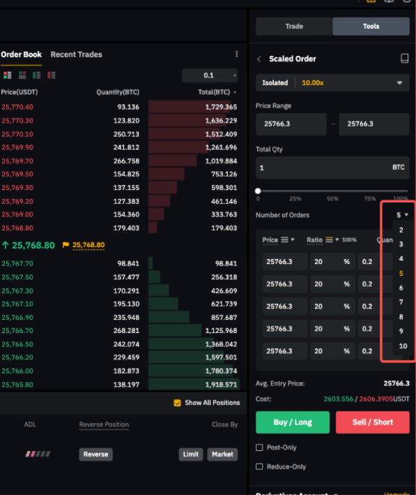 Step 3: On PC, click on the Tools tab and select Scaled Order. Input your preferred Price Range (the upper and lower bound of your scaled order) and Total Qty for your scaled order.