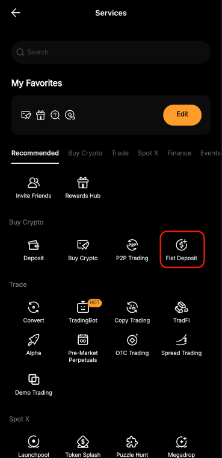 在应用程序上,请转到主页并点击更多,然后选择法币充值。接下来,点击法定货币以查看每种可用付款方式的相关费用。