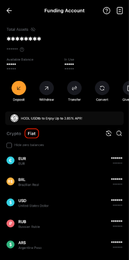 在应用程序上,请转到资产页面,然后点击资金 → 法币。然后,点击法币货币,并参考每种付款方式的相关费用。
