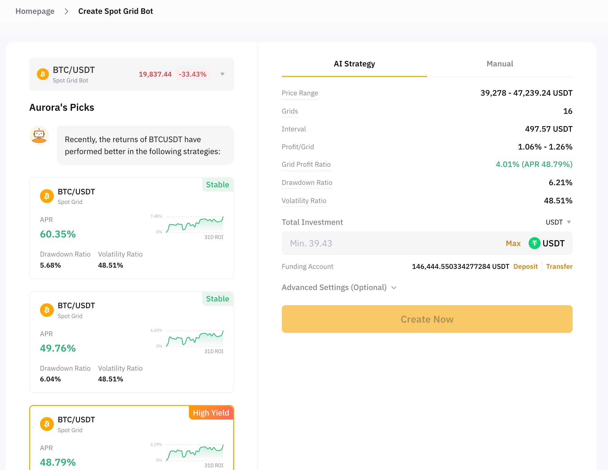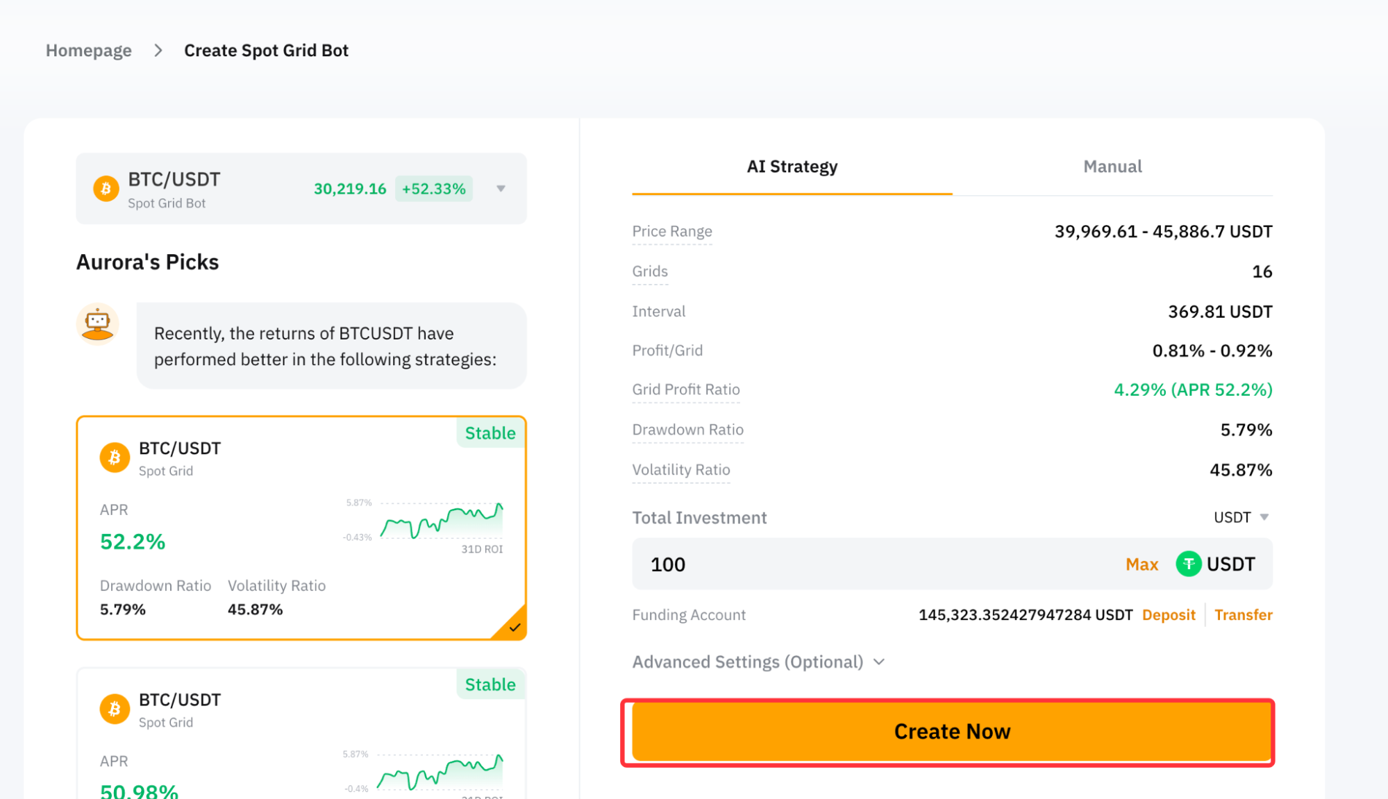 第 2 步:点击立即创建前往创建现货网格机器人页面,创建您的现货网格机器人。