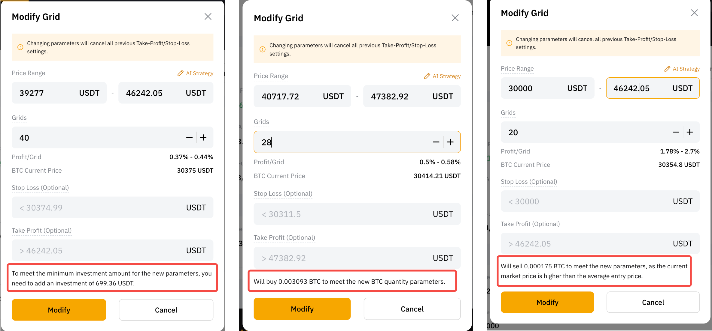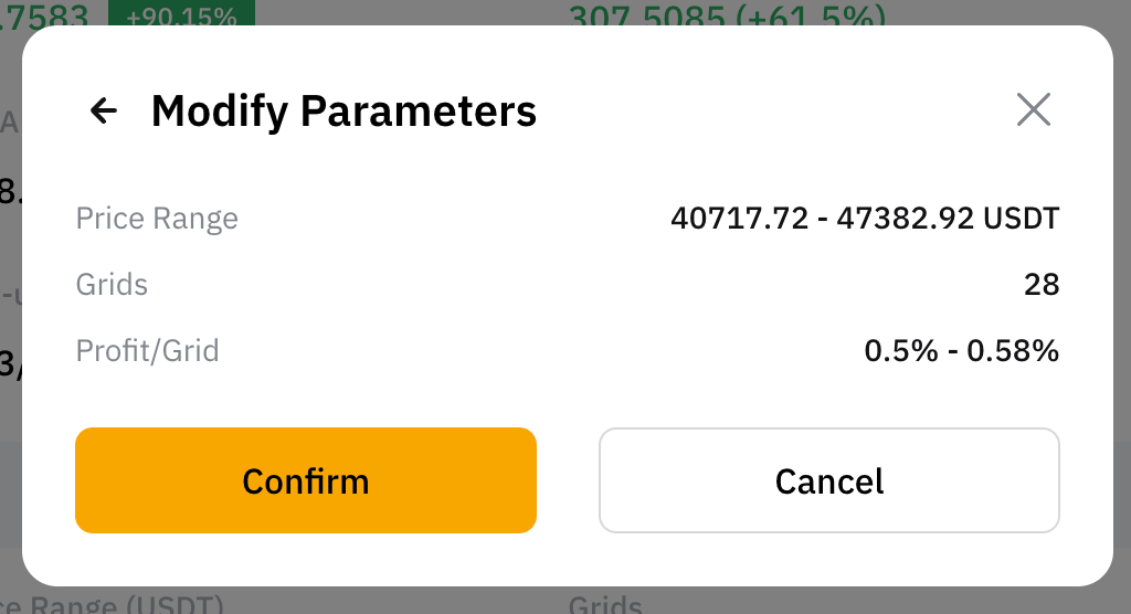 第 2 步:修改价格区间、网格数或止盈/止损。为实现新的参数,可能需要追加投资金额或修改基础代币买入/卖出数量。