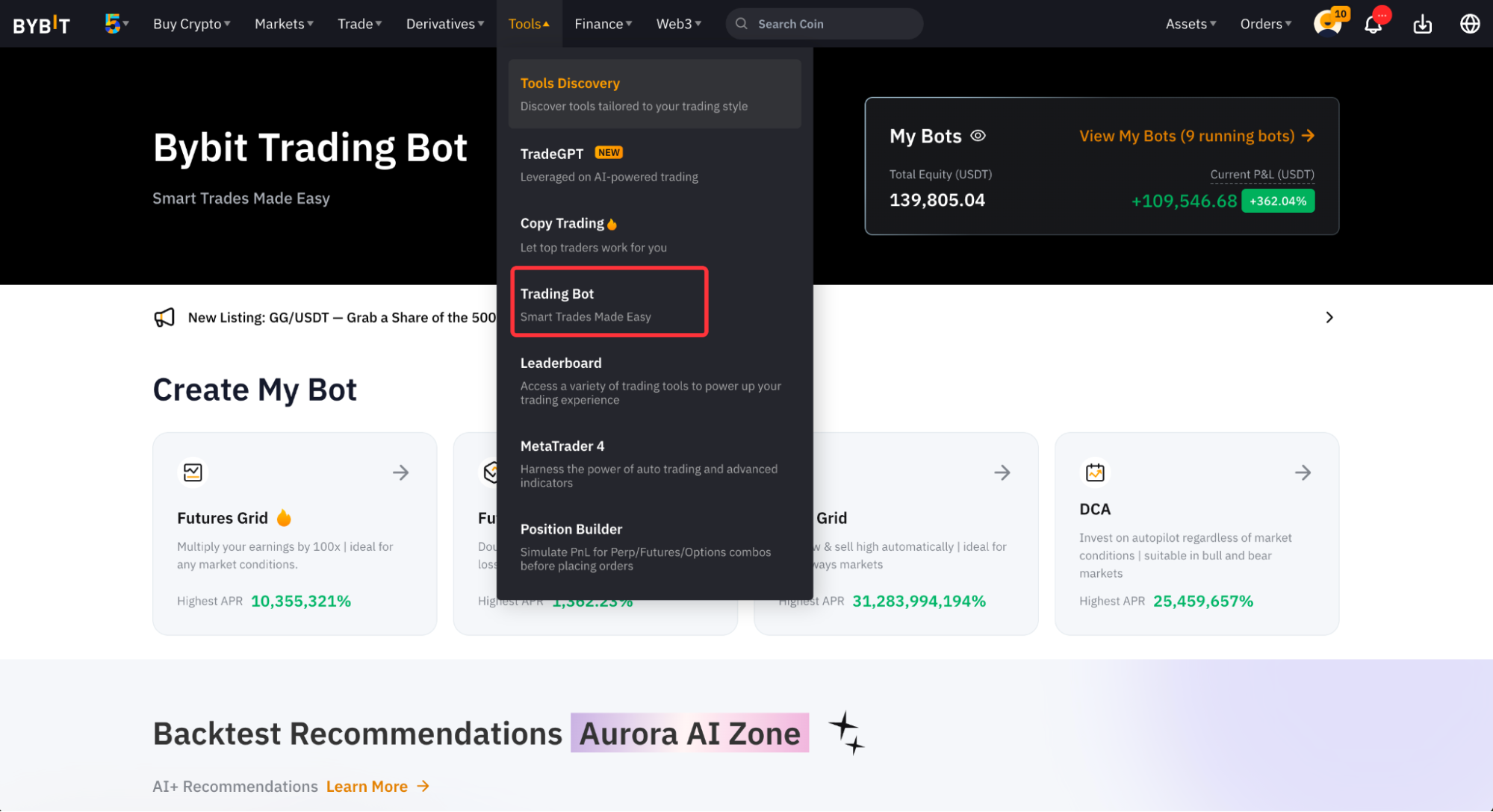 第 1 步:在导航栏中点击交易 –> 交易机器人,进入 Bybit 交易机器人页面。