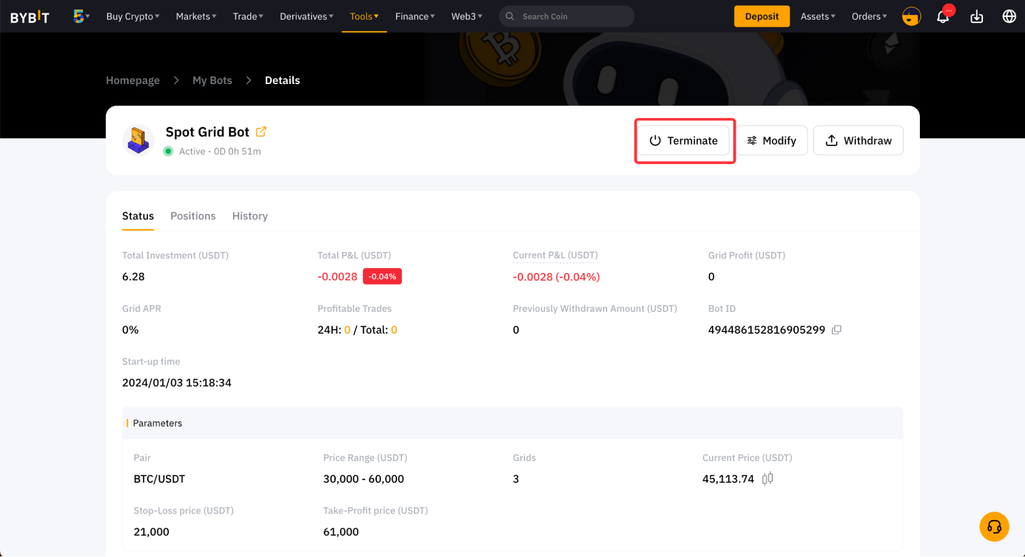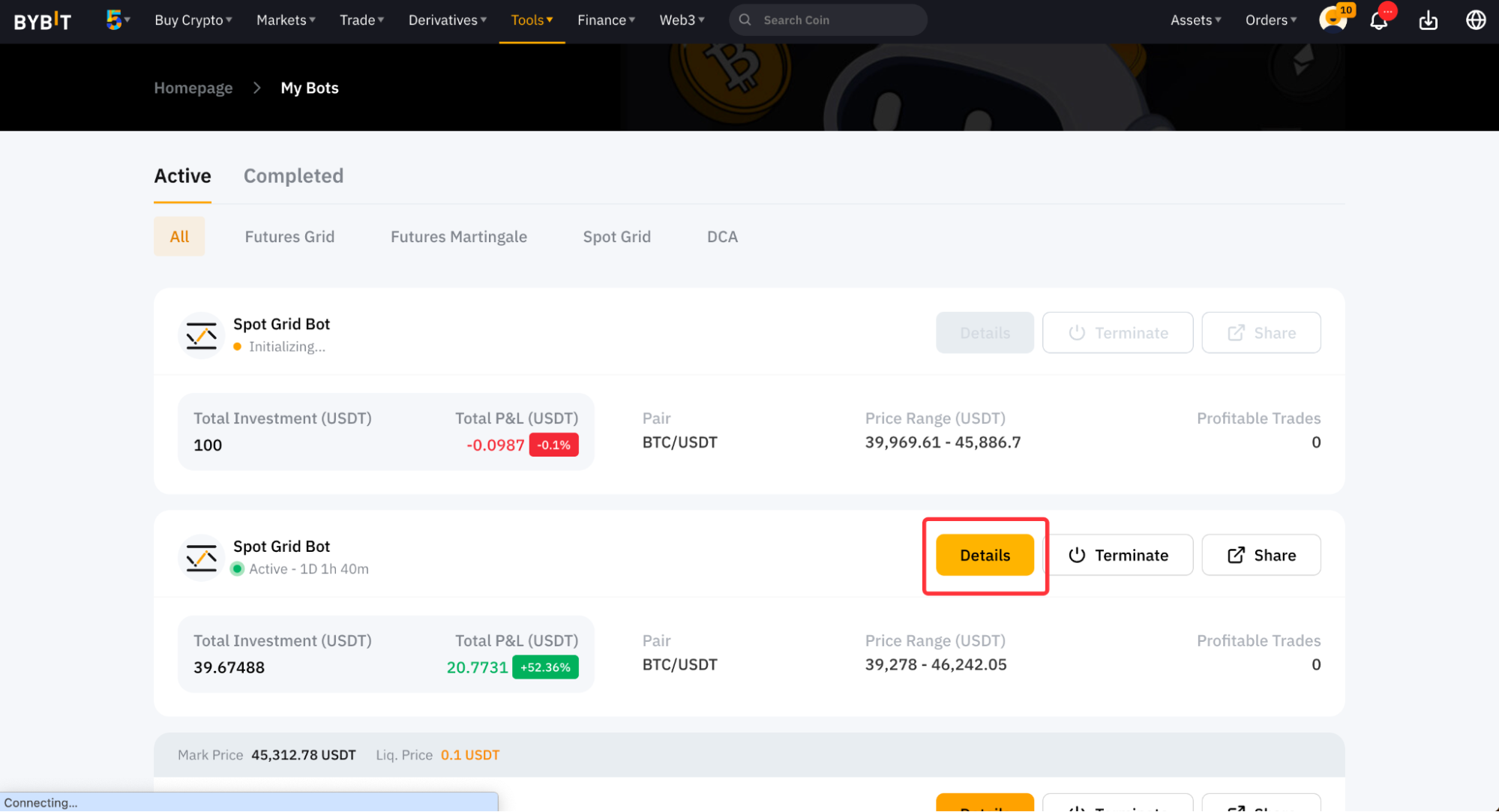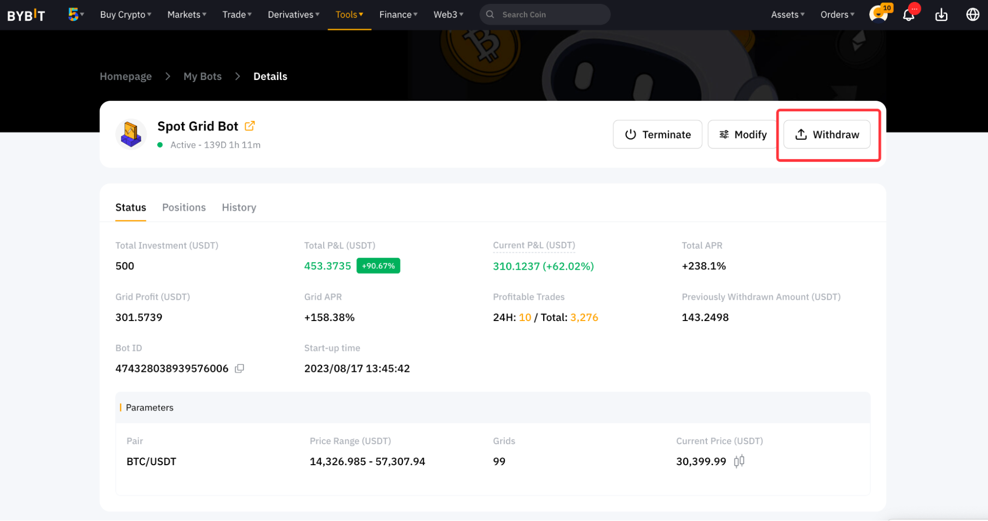 如果您之前已经创建了 Bybit 交易机器人,您可以在 Bybit 交易机器人页面右上角的我的机器人下查看总净值 (USDT)当前盈亏 (USDT)