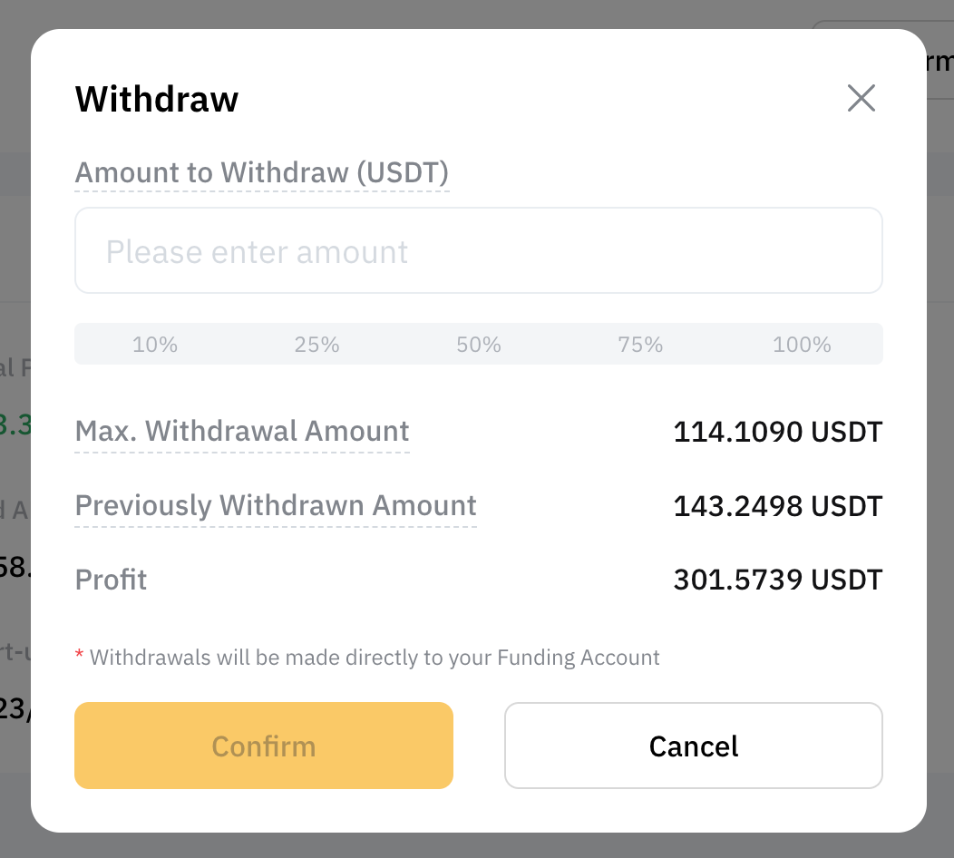 您可提取的最高金额为手续费扣除后的网格收益。您可参考提取窗口中显示的最大可提取金额。已提取的金额将划转至您的资金账户。