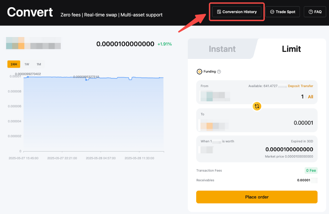 资金账户和统一交易账户均支持即时模式,而限价模式仅支持资金账户。请确保您的资金处于正确的账户中,然后再进行兑换。