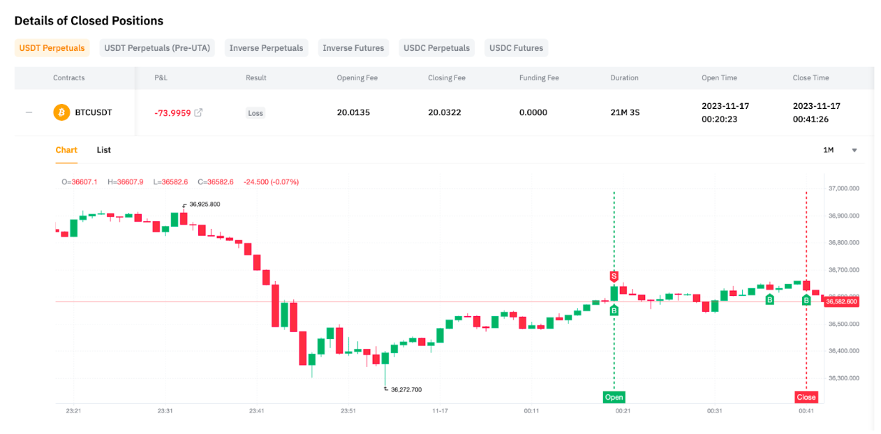 在平仓仓位详情选项卡中,您可以展开每个平仓仓位,查看显示入场价格和出场价格的图表。此外,您还可以在右上角选择图表的时间间隔并调整图表大小。