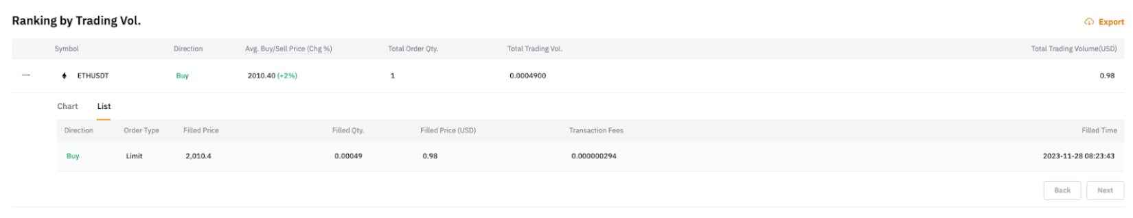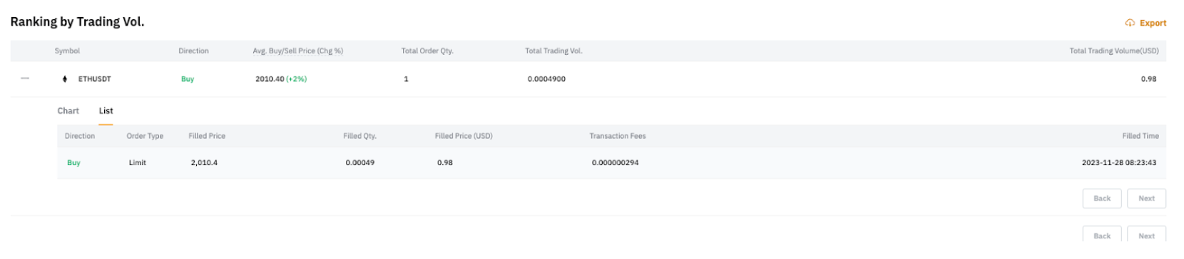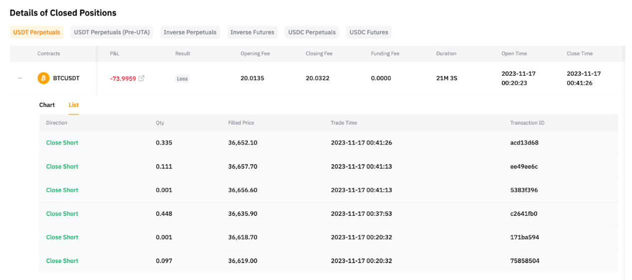 在列表选项卡中,您可以访问在所选时间段内与该币对相关的所有交易。