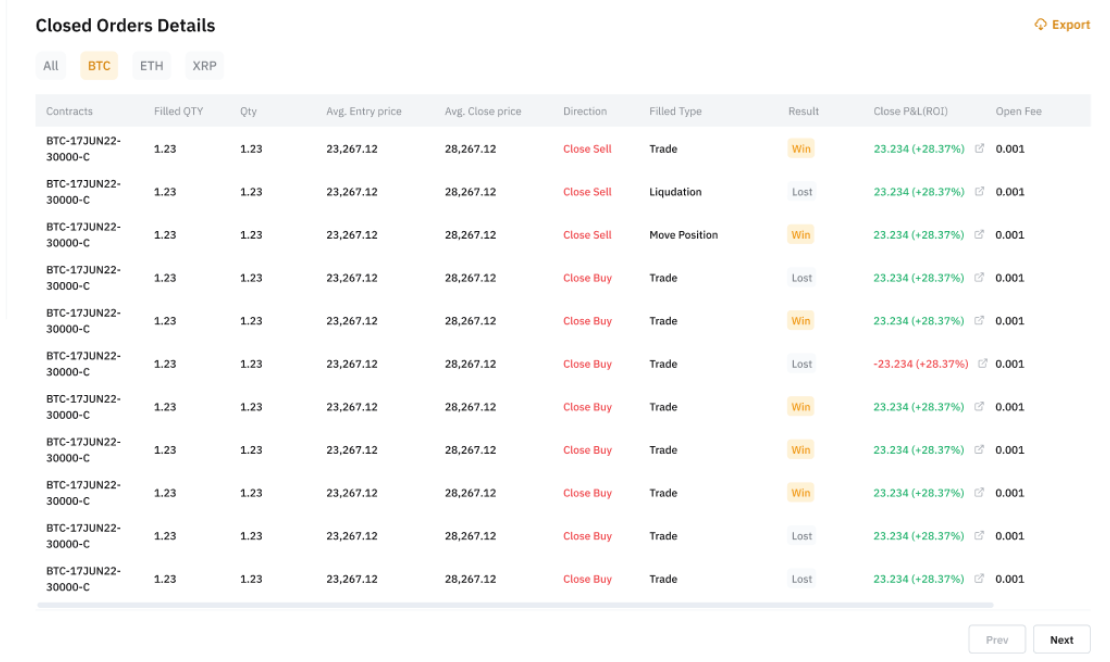 在此选项卡中,您可以查看已平仓的多仓和空仓的综合记录,包括从初始开仓订单到最终平仓订单的详细信息。在较长时间内进行多次部分平仓的交易者可以评估其交易历史、估算收益并衡量其策略是否成功。