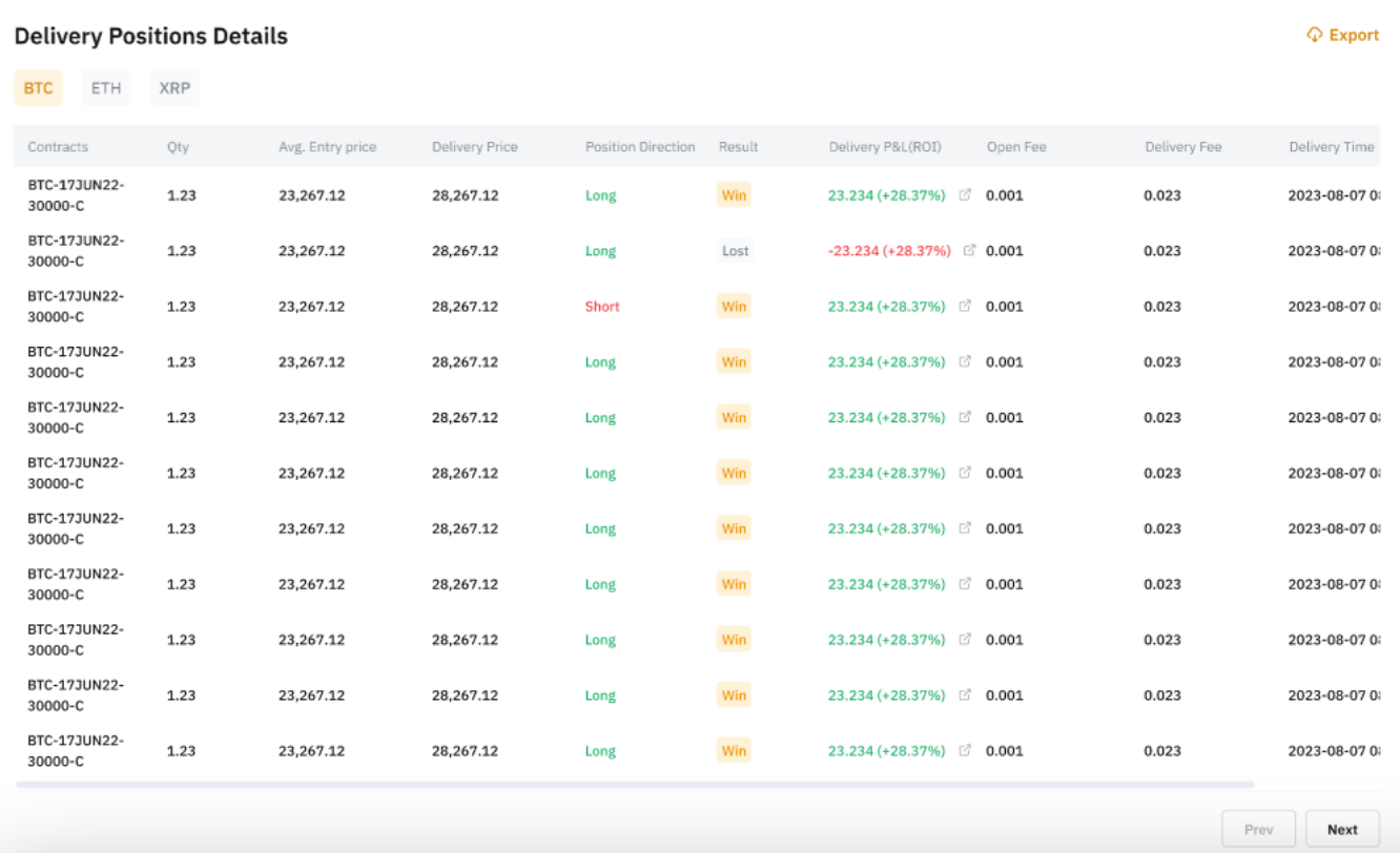 在交割仓位明细选项卡中,您可以选择全部查看所有交易仓位。或者,您可以访问指定合约的综合仓位详情,包括合约名称、数量、平均入场价格、交割价格、已实现价格等。