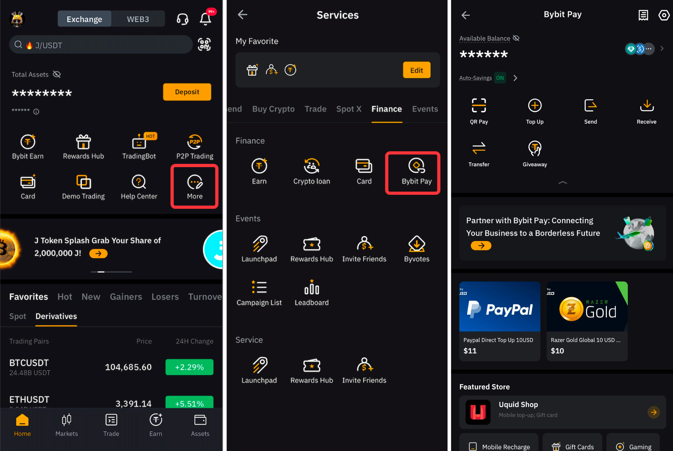如果您使用 Bybit App,請先啟動 Bybit App,然後登入您的帳號。點擊主頁上的“更多”,然後點擊Bybit 支付。