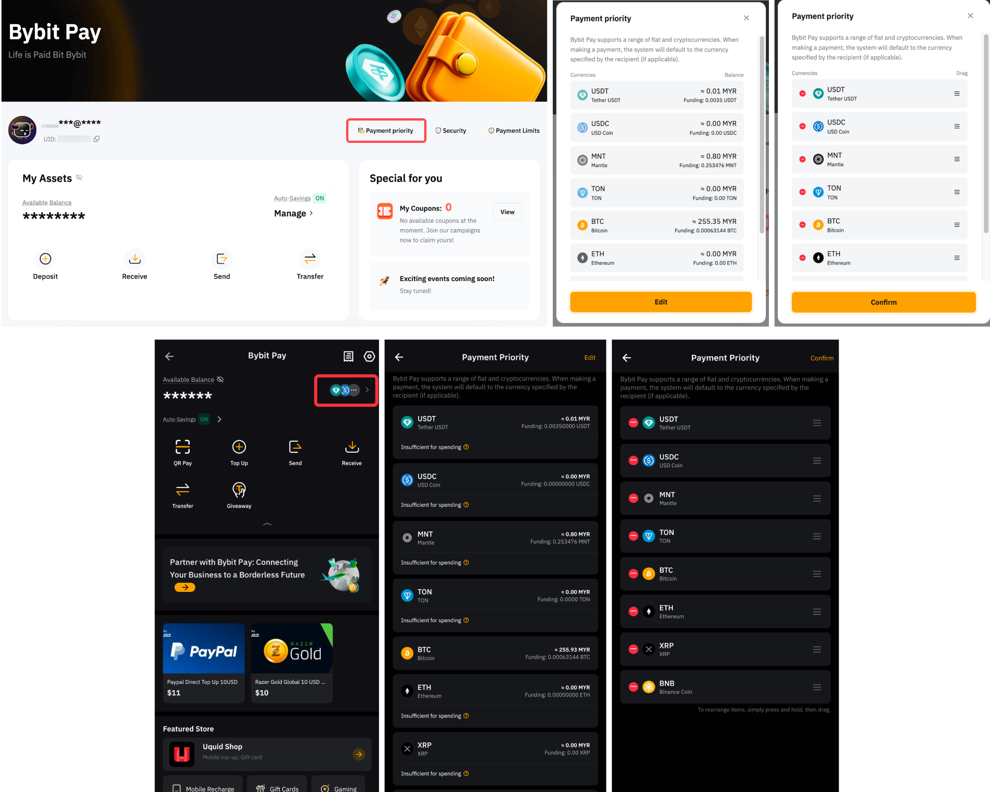 前往 Bybit 支付頁面 →支付優先權→編輯 →點擊移除/新增按鈕,然後拖曳調整順序。
