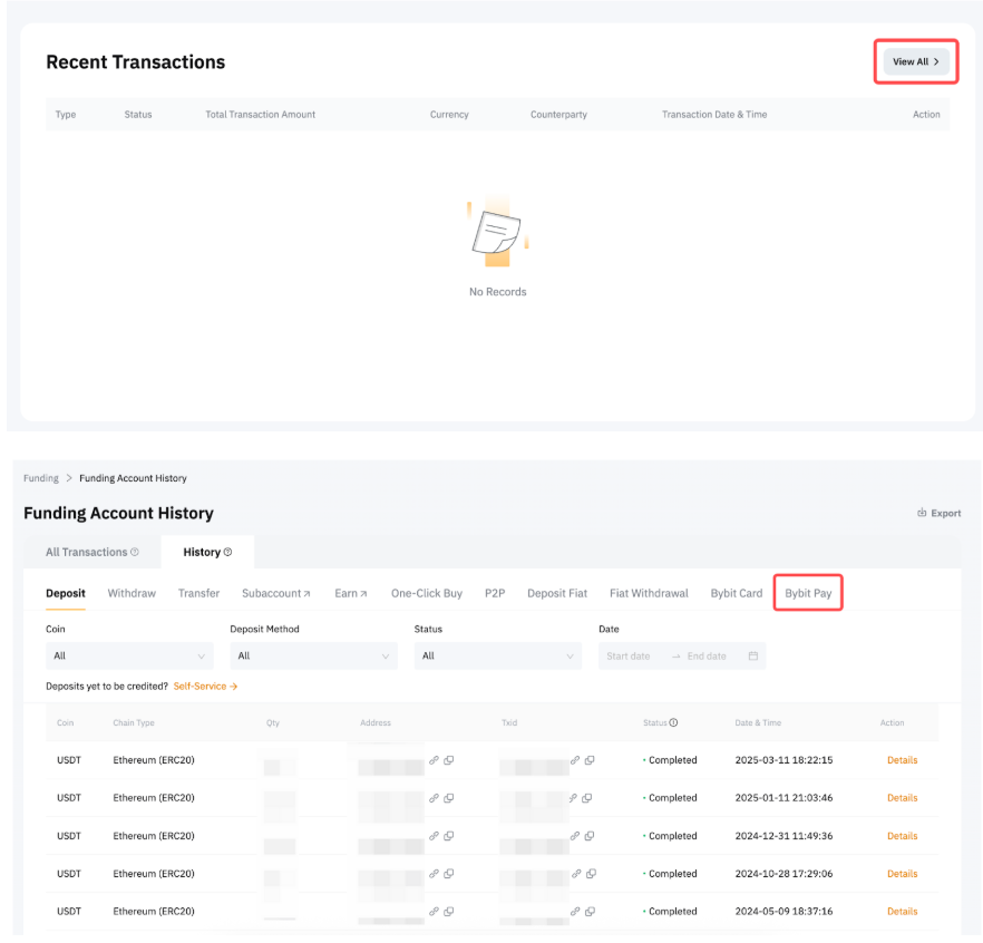 在網站上,前往 Bybit 支付 頁面,向下捲動至底部,找到近期交易,然後點擊看全部。或者,您也可以前往資金帳戶→歷史 → Bybit 支付 找到交易記錄。