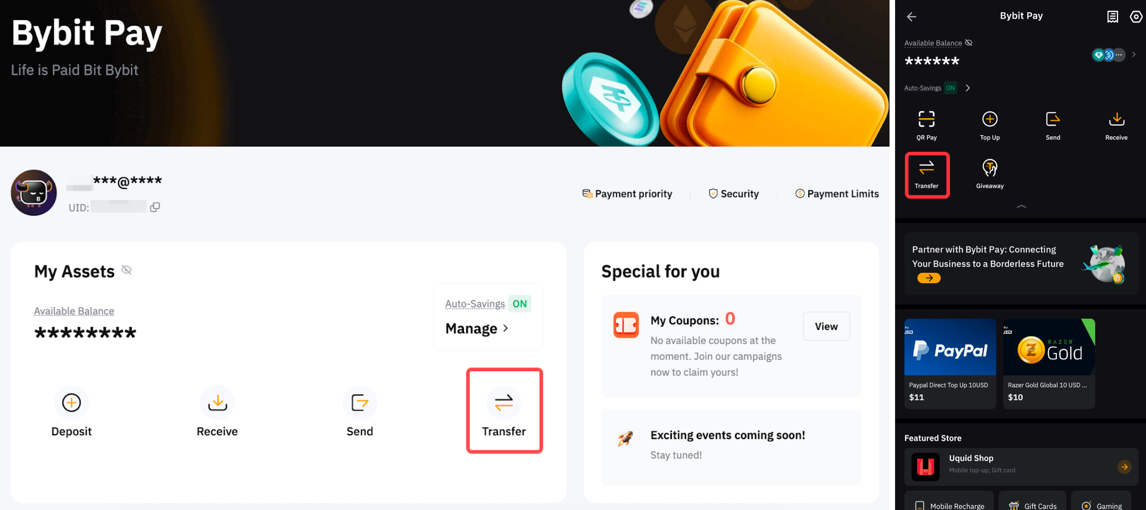 使用其他 Bybit Pay 使用者和商家的帳戶資訊或二維碼進行內部轉賬,向他們發送付款,並從他們那裡收款。