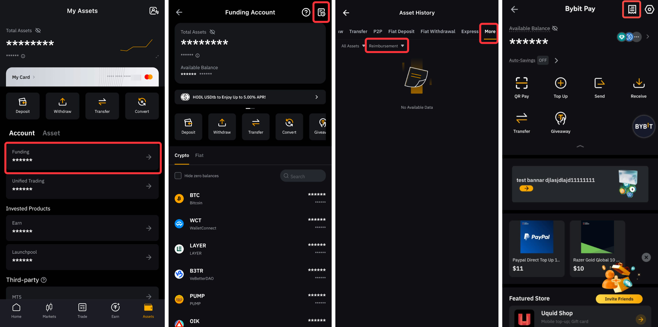 在 App 上,前往資產→ 資金帳戶 → 更多,然後將類型篩選為Bybit 支付。或者,您也可以前往 Bybit 付款頁面,點選右上角的紙本圖示.