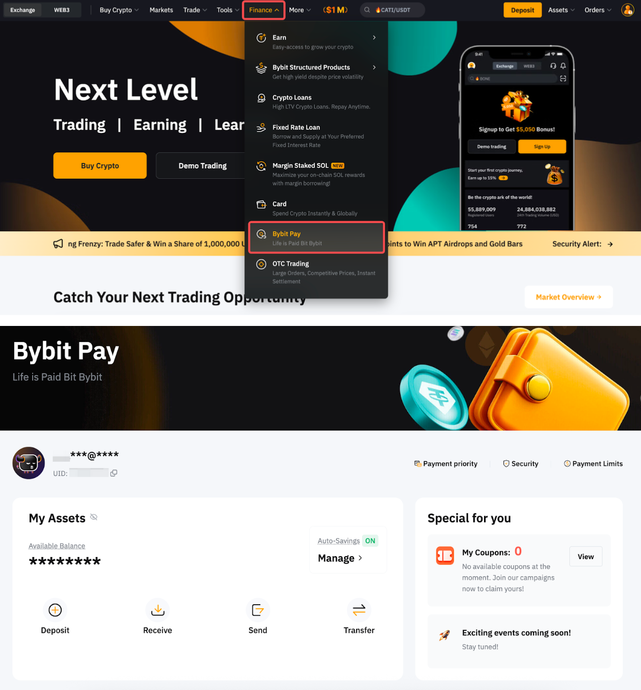 如果您在 Bybit 網站上,請點選金融,然後點擊 Bybit 支付。