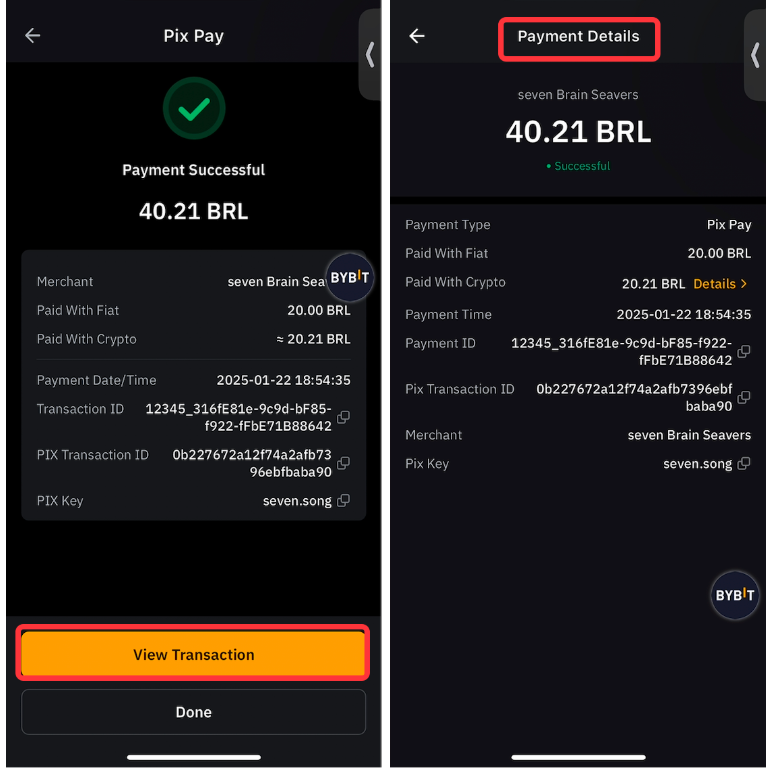所有交易記錄,包括使用 Bybit Card 的 PIX支付 和 Bybit Pay,都將記錄在 Bybit Pay 交易記錄中。