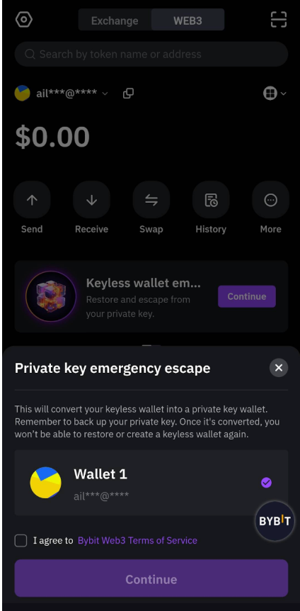 選擇您的 MPC 錢包,然後使用 Bybit 錢包服務條款進行確認,然後點擊「繼續”,將您的 MPC(無密鑰錢包)轉入種子短語