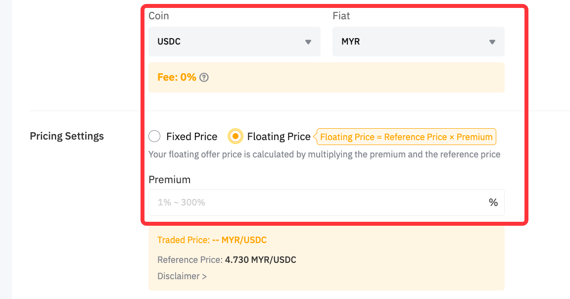 有。 在發佈廣告頁面的溢價指標中,即可查對廣告的價格區間。 值得注意的是,廣告所選的每個幣種都將同時顯示固定價格和浮動價格。