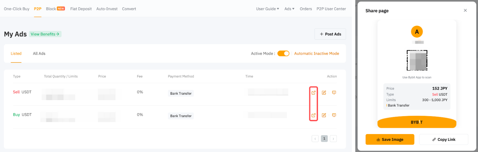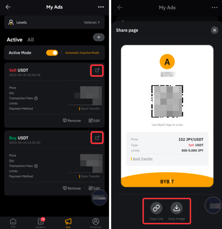 您可以透過二維碼或 URL 連結分享您的廣告。廣告可以設定為公開或非公開。公開廣告在P2P廣告頁面上可見,非公開廣告只有擁有二維碼或URL連結的交易者才能存取。