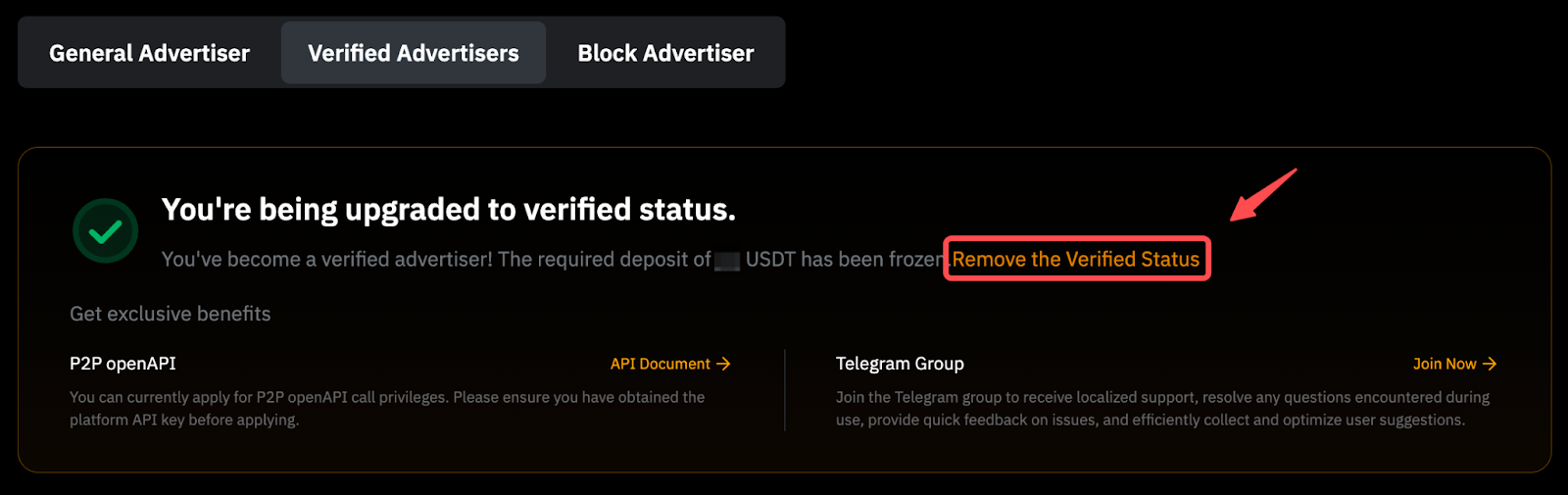 如果您的帳戶被系統的風險控制標記,某些廣告商利益,例如發布多個買入或賣出廣告,可能會受到限制。 如需了解更多信息,請至 P2P廣告方申請頁面上找到受限廣告商信息,或參閱這篇文章