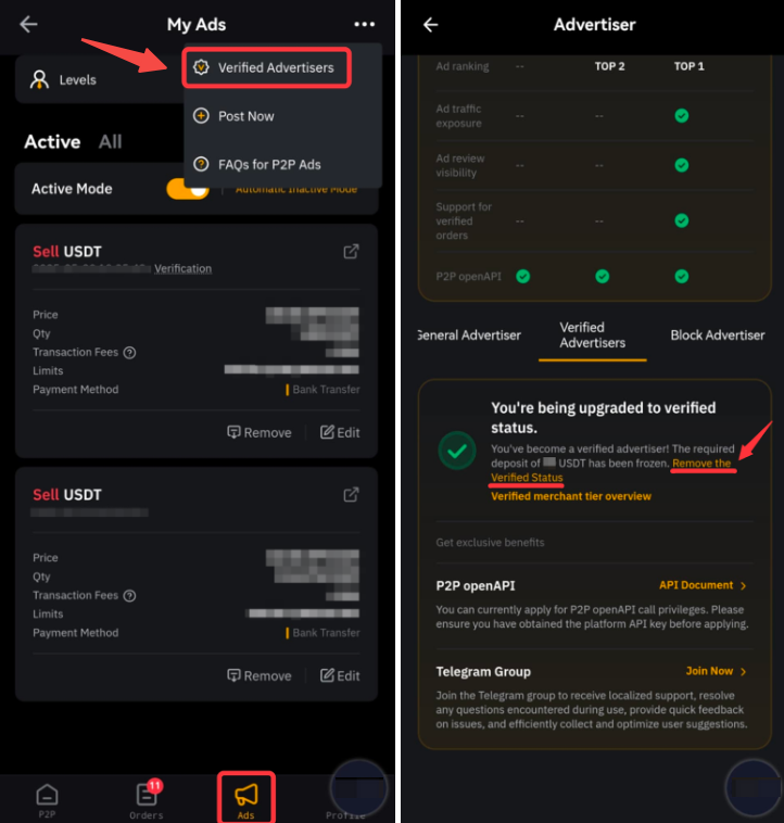 在應用程式上,前往 P2P 交易頁面 → 廣告,點選右上角的 3 個點圖示,然後選擇已驗證的廣告商,然後按一下移除已驗證的狀態