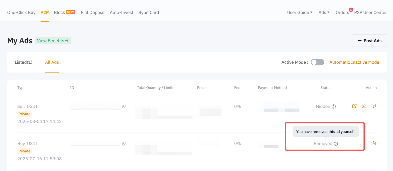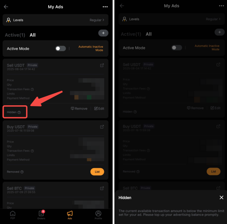 在 App 上,前往 P2P 交易 廣告 全部查看已刪除或隱藏的廣告清單。然後,點擊狀態查看原因。