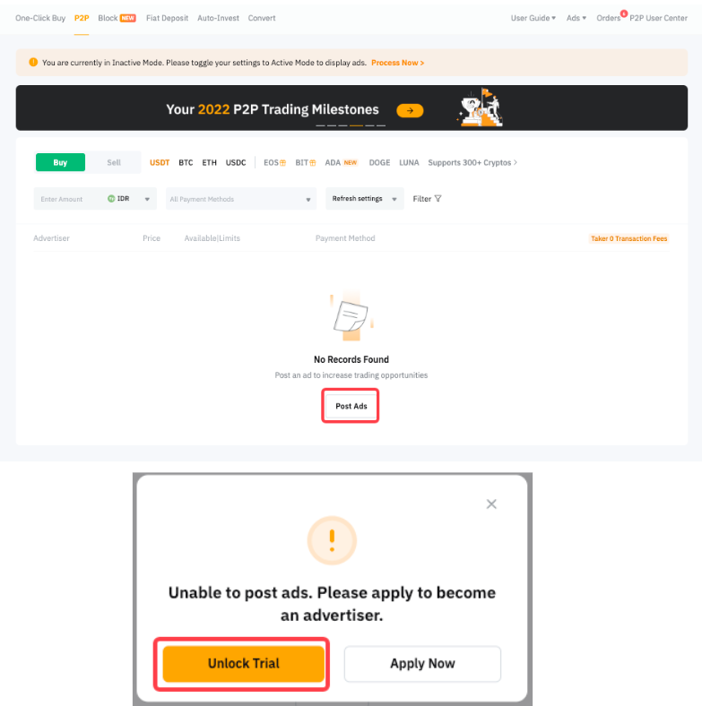 目前,廣告商不會因發布廣告而收取任何費用。 但請注意,用戶需支付交易費,該費用可能因法定貨幣、支付方式、廣告商級別或廣告類型而異。 請參閱此文章,了解適用於 P2P 的手續費。