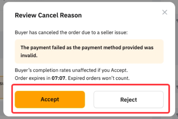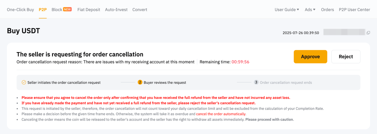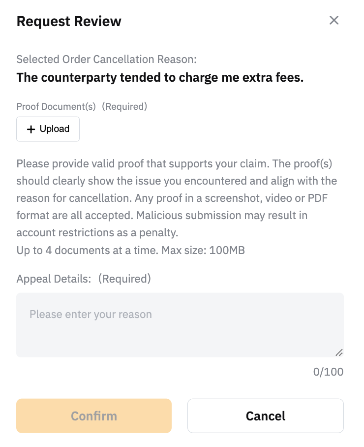 如果您堅信取消是由於賣方的過錯造成的,請點擊請求審查並提供支持您申訴的有效證明,提交上訴。P2P 專員將在 1-2 個工作日內協助您的請求。