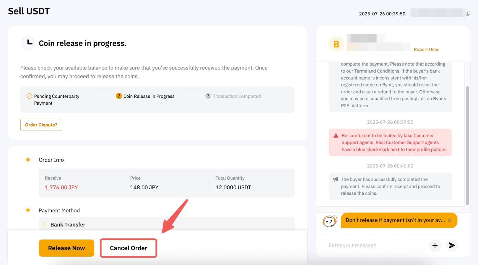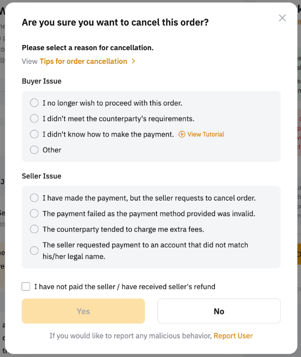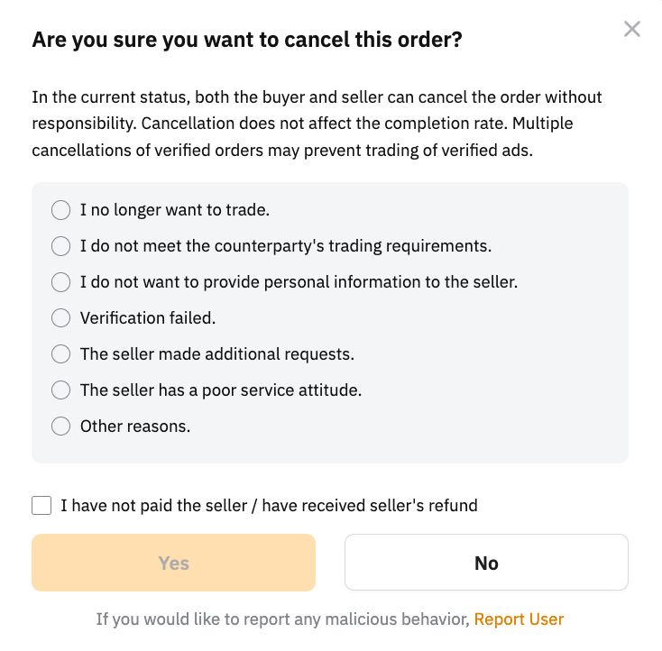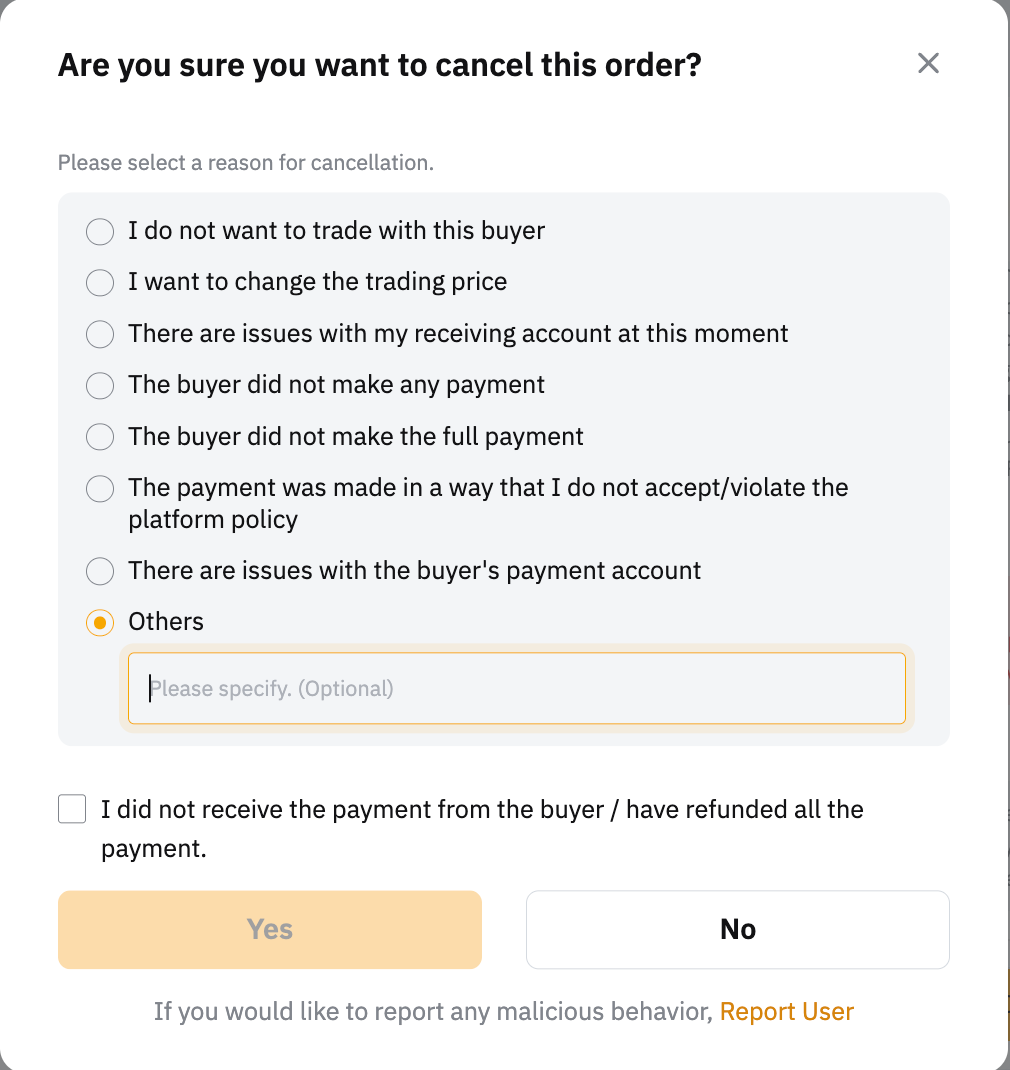 2. 賣方可提交訂單取消請求,供買方在訂單狀態為正在釋放貨幣時確認。