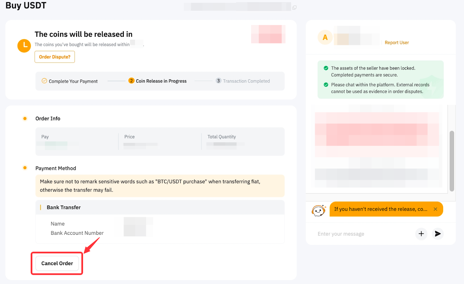 1. 當訂單狀態為待支付款項正在釋放貨幣時,買方可以取消訂單。