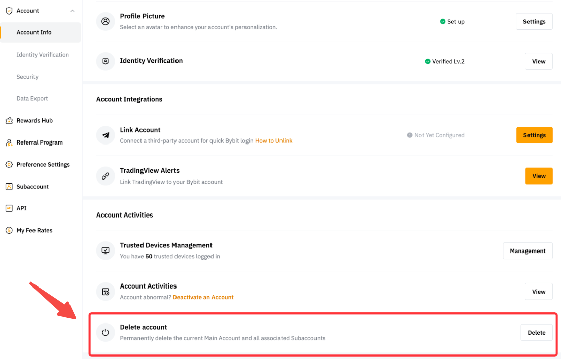 Bybit 推出了自助帳戶刪除功能,使用者可透過賬戶信息頁面自行刪除帳戶。