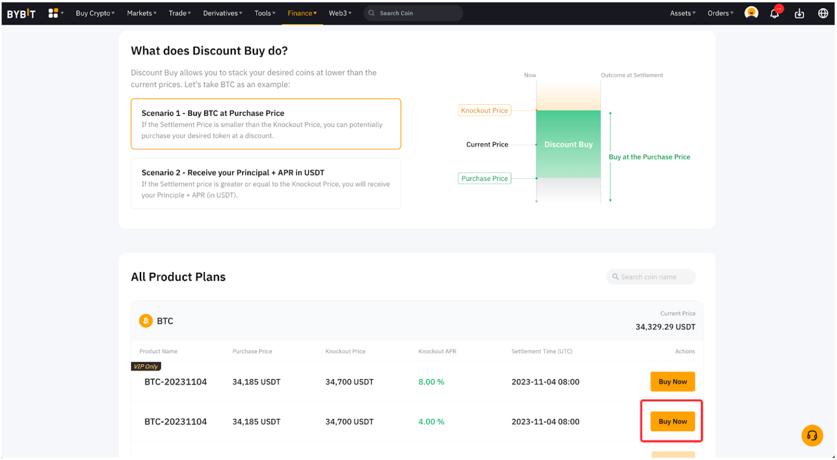 在 Bybit 導航欄中點擊金融→ 理財→ 折價買幣,進入折價買幣頁面。