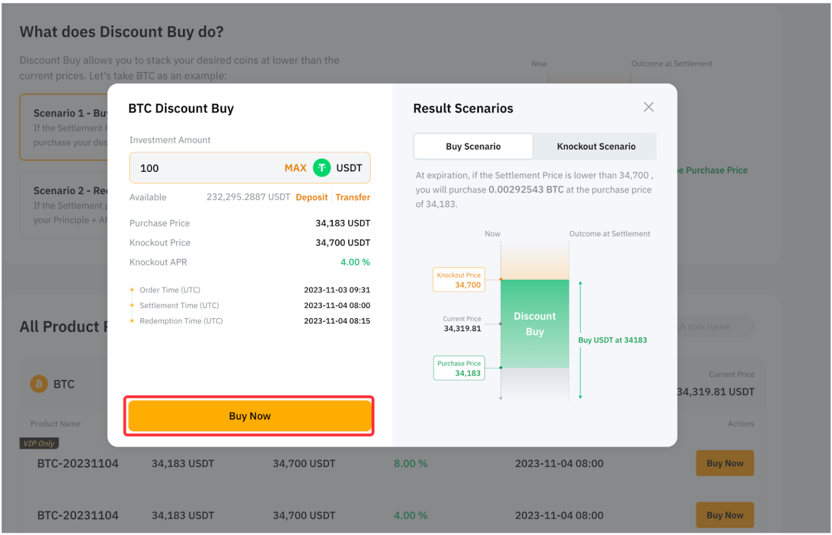 根據幣種查看可選方案、購買價格、敲出價格和敲出年化收益,並選定要申購的方案。然後,輕點立即申購
